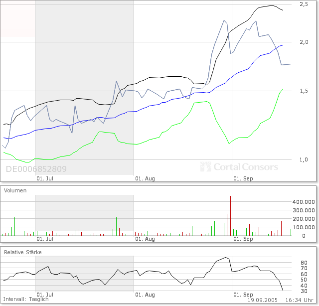 hatten wir im Mai 05 ein starkes Top/ Unterstuetzung des Aufwaertstrendkanals geht auch durch die 1,70 €/ Down-Volumina waren diese Woche ebenfalls sehr gering: spricht alles dafuer, dass wir naechste Woche Plussis sehen. Ich bleib mal drin, auch wenns mir ein wenig mulmig ist ;-)