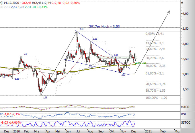 Es kommt dann der Widerstandsbereich von rund 3,50 Euro in den Fokus. Hierbei handelt es sich um einen stärkeren Widerstand.