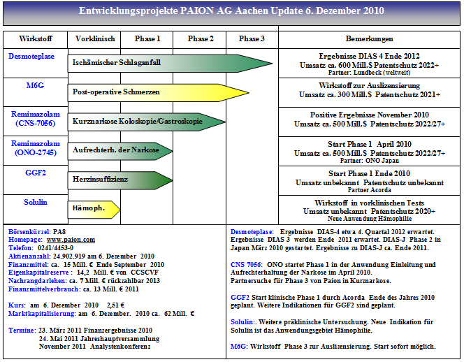Aachen, 06. Dezember 2010 - Das biopharmazeutische Unternehmen PAION AG (ISIN DE000A0B65S3; Frankfurter Wertpapierbörse, Prime Standard: PA8) gibt heute positive präklinische Daten mit seinem rekombinanten, humanen Thrombomodulin Solulin in der Indikation Hämophilie bekannt.
