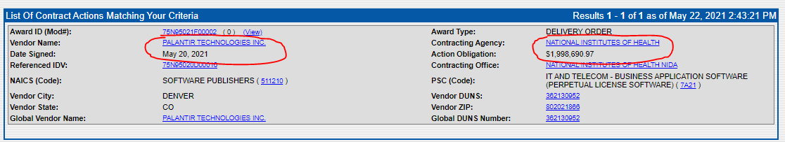 On May 13, 2021 the Department of Veterans Affairs (VA), Technology Acquisition Center issued a modification to i3 Federal, LLC (I3) for an extension to Contract NNG15SD31B Order 36C10B21F0031 for the current Palantir Gotham Software as a Service (SaaS) subscription to include hosting, operation support, professional services, and maintenance. VA issued a competitive solicitation on April 2, 2021 to compete for a new solution, but a pre-award protest filed with the Government Accountability Office has delayed award. VA has a continuing need for the data management and operational decision support currently being provided under this order. This modification will extend the current SaaS subscription to include hosting, operation support, professional services, and maintenance for three months with a three-month option period. Amount obligated at time of award $4,148,478.72, total award amount $8,296,957.44.