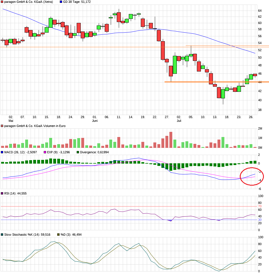 Locker? Also so locker ist es auch nicht. Denn an der Börse kann viel passieren, was man so nicht erwartet hat. Braucht nur eine Gesamtschwäche etwas größer zu werden die kommenden Wochen, dann werden Paragon und Co. mit runtergezogen. Die Aktie ist die letzten Tage ca. 3 Euro wieder zurückgefallen und steht etwas über 46€. Schau auch mal über den kurzfristigen Tellerrand. Da ist z.B. von höherem Hoch nichts zu sehen. Am horizontalen Widerstand um die 50er Marke ist man nicht nachhaltig durchgekommen und das wertvollste Asset von Paragon ist weiterhin Voltabox. Deren Aktienkurs fällt seit Wochen. Von daher war der jüngste Anstieg bei Paragon nicht unwesentlich auch von gewissen Push-Medien und Nebenwert-Pushforen angekurbelt worden und weniger von realen Wertentwicklungen bei Voltabox. Jetzt muß der Dackel Paragon wohl erstmal wieder zurück zum Herrchen Volatbox an die kurze Leine. Ohne deutlich steigende Kurse bei Voltabox geht auch Paragon nicht wirklich dauerhaft deutlich höher. Deswegen Vorsicht mit Begriffen wie "locker". Und wenn man Volatbox immer im Auge haben muß, dann kann man auch gleich das "Orignal" als Pure Play kaufen anstatt indirekt Paragon, mit seinem ansonsten eher langweiligem Zulieferer-Gemischtwarenladen, den man da mitkaufen muß. Und wie es der ...hüstel "Zufall" will, gibt es sowohl die Voltabox wie auch die Paragon Hj1 Zahlen am 21.8. Also wenn Voltabox Zahlen bringt die den Kurs wieder in Regionen von 24 oder mehr schieben, dann sind deine 52/54 bei Paragon vorstellbar. Ob es so kommt? Kann keiner sagen. Kann auch ganz anders kommen. Entsprechend würde ich erstmal neue FAKTEN abwarten und dann weitere Einschätzungen vornehmen