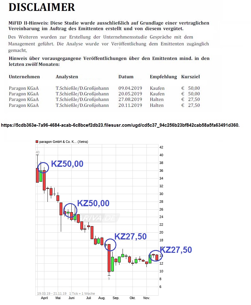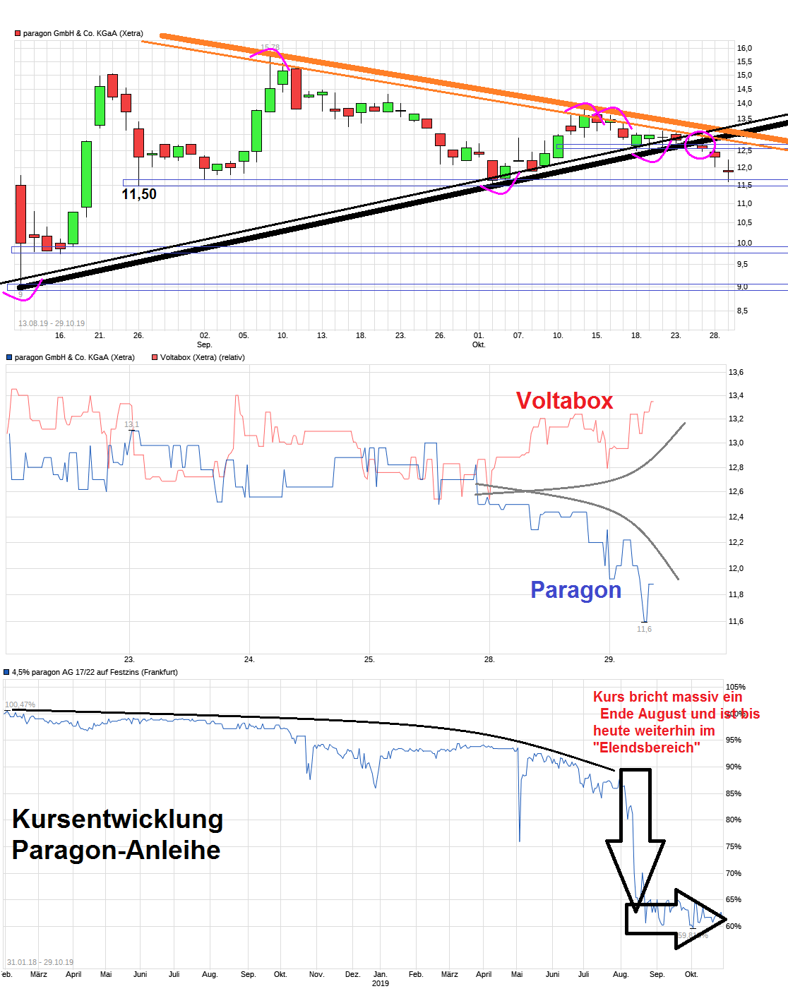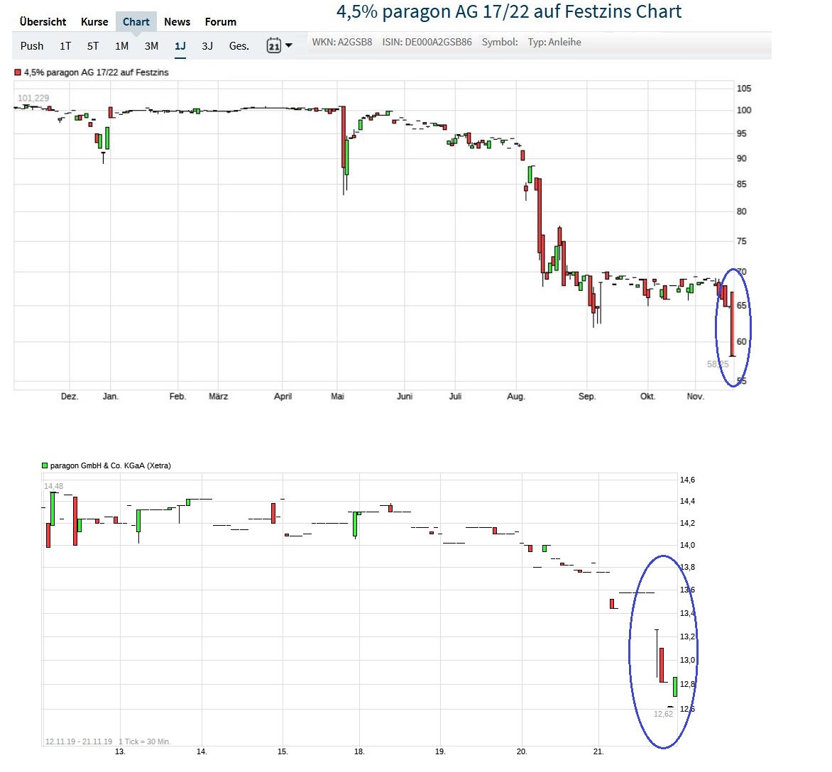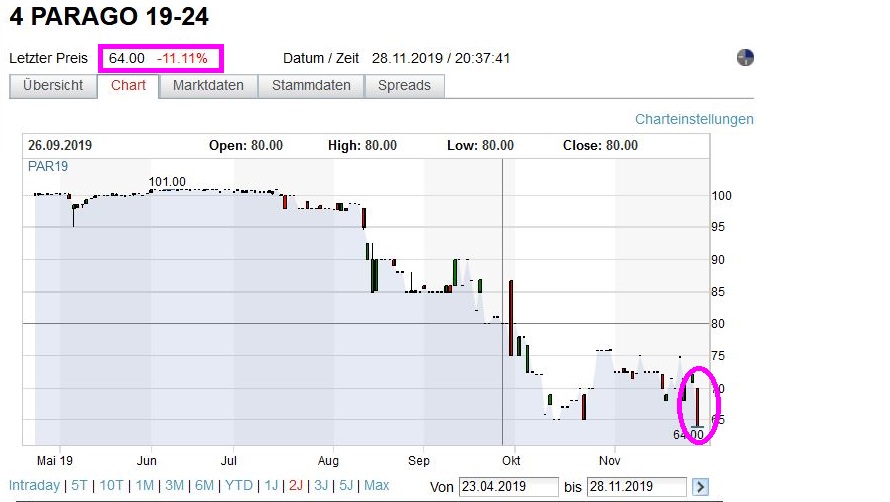 Und ein Blick auf die Anleihe ( die ja in erster Linie nur von Profis gehandelt wird), zeigt durch den starken Kursverfall auch, daß man scheinbar eine deutlich steigende Wahrscheinlichkeit sieht für unschöne Dinge bei Paragon. Mal schauen was also bei den nächsten Q.Zahlen und Prognose-Updates dann präsentiert wird.