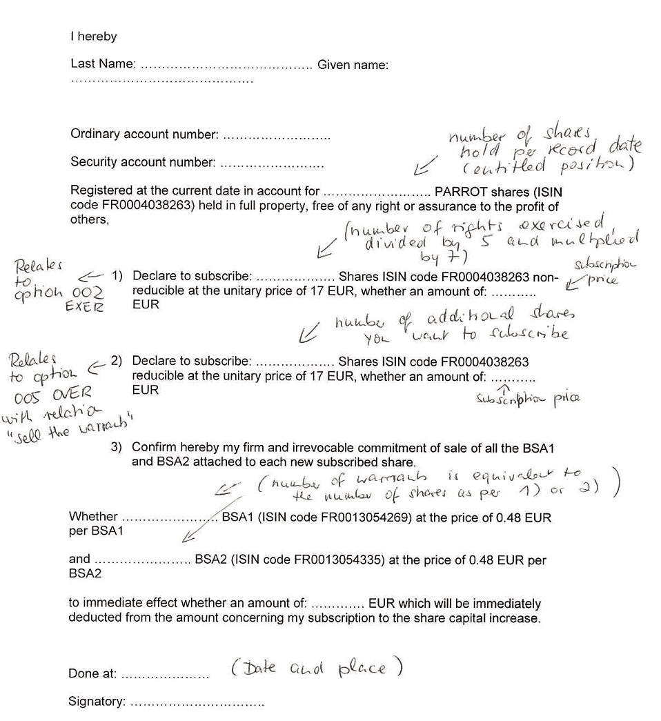 ==> letzteres klingt für mich danach, als solle man dort den Betrag eintragen welcher durch den Verkauf der Optionen vom Gesamtpreis für den Bezug von Parrot-Aktien abgezogen werden muss. Nur fraglich warum die sich das nicht selber ausrechnen können....