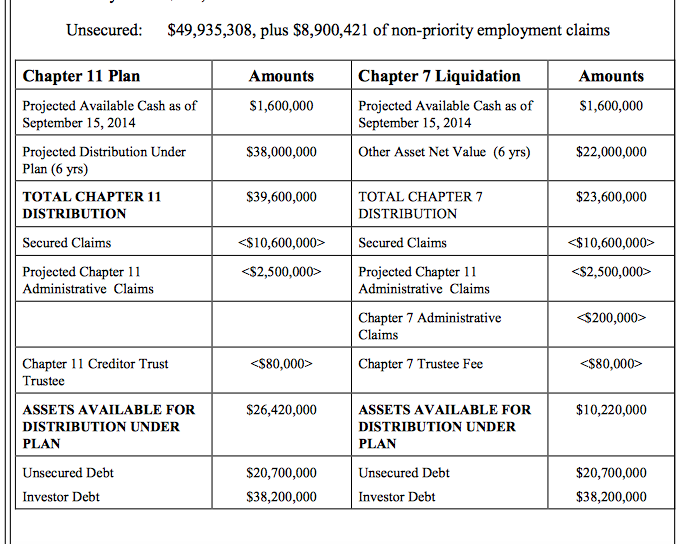 "After deductions of secured claims and priority claims, as well as expenses of administration, there would be $26,920,000 available to distribute in a Chapter 11 as opposed to only $10,720,000 in a Chapter 7."