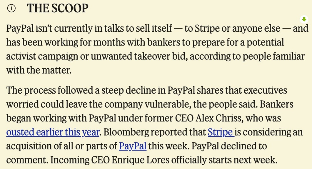Die Firma PayPal hat nach der Ablösung von eBay nun neue Möglichkeiten und Restriktionen. Mir geht es darum in diesem Forum die Entwicklung und Möglichkeiten zu diskutieren - sich über die Einschätzung der Performance auszutauschen und Erwartungen an das Unternehmen auszutauschen.