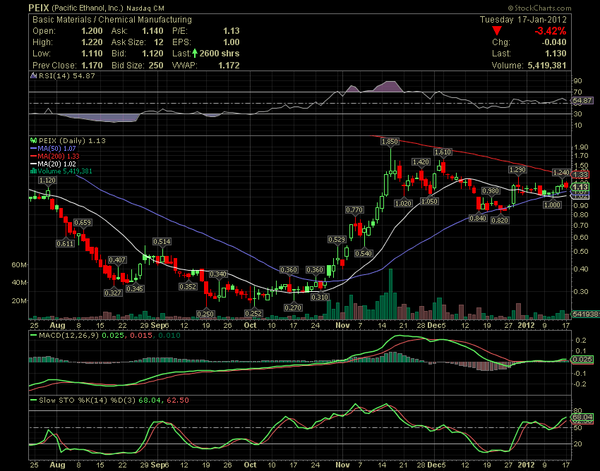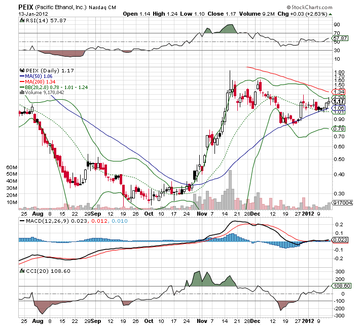 As for Pacific Ethanol Inc., it's following in the same footsteps as BIOF... only it would probably be considered more technically sound as a breakout candidate by most traders. PEIX didn't soar out of control in November, skewing the charts to a point where its upper limit was unclear.