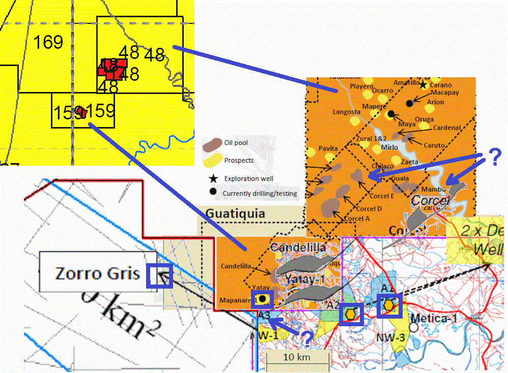 Der Prospect A3 bzw. NW1 links in der Ecke liegt extrem nah an Mapanare, aber auch sehr nah an der Stelle, wo PMG Yatay (10,440 bopd) einzeichnet. Je nachdem wie Mapanare ausgeht, könnte der viellecht besonders interessant werden.