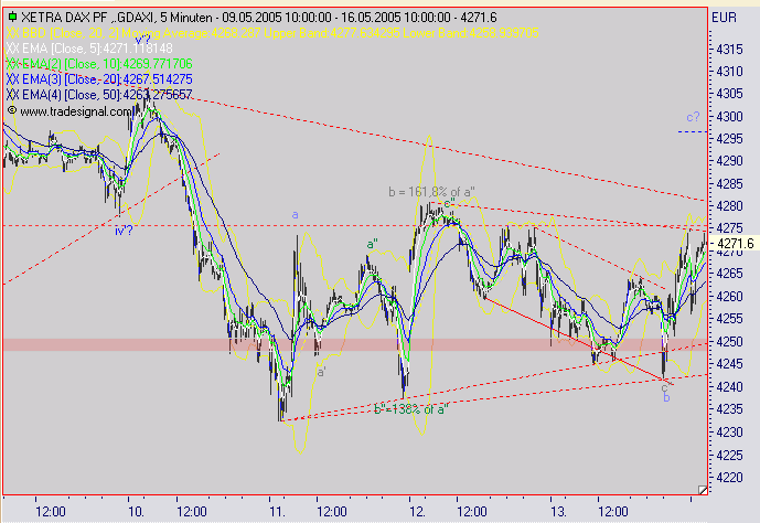 Die in der letzten Analyse prognostizierte Kursspanne für Donnerstag und Freitag wurde eingehalten, so daß sich der freundliche bis neutrale kurzfristige Ausblick als richtig erwies. Der Markt konnte weder die 4280 nachhaltig überwinden, noch wurde die nach unten kritische Marke 4232 unterboten.