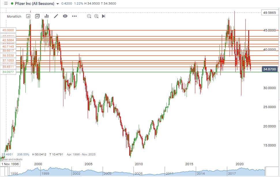 Nachdem ich Bristol-M. eingesammelt habe, möchte ich das Körbchen nun für ein paar Anteilsscheinchen von Pfizer aufstellen. Allerdings mit einer etwas vorsichtigeren Strategie des vorsichtigen Herantastens, da ich dem Braten noch nicht ganz traue. Das Momentum ist immer noch negativ!