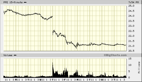 Wenn jedoch PPT-Stützungskäufe stattfinden, greifen die üblichen Erwartungen der Charttechnik nicht. (Sie lassen sich mit Charttechnik ebensowenig vorhersagen wie der Ausgang des Lipitor-Prozesses.) Letztlich kann Pfizers Broker den Kurs mit den "Stützungs-Milliarden" beliebig manipulieren - auch nach oben, indem er (in umgekehrter Strategie der Hedgefonds) ständig das "Ask komplett weghaut" und damit einen Short-Squeeze schürt. Daran scheint PFE vor dem Lipitor-Urteil aber nicht gelegen zu sein. Wenn die Aktie nahe dem 8-Jahres-Tief mäandert, drückt das effektiver auf etwaige Tränendrüsen der Gerichtsbarkeit.