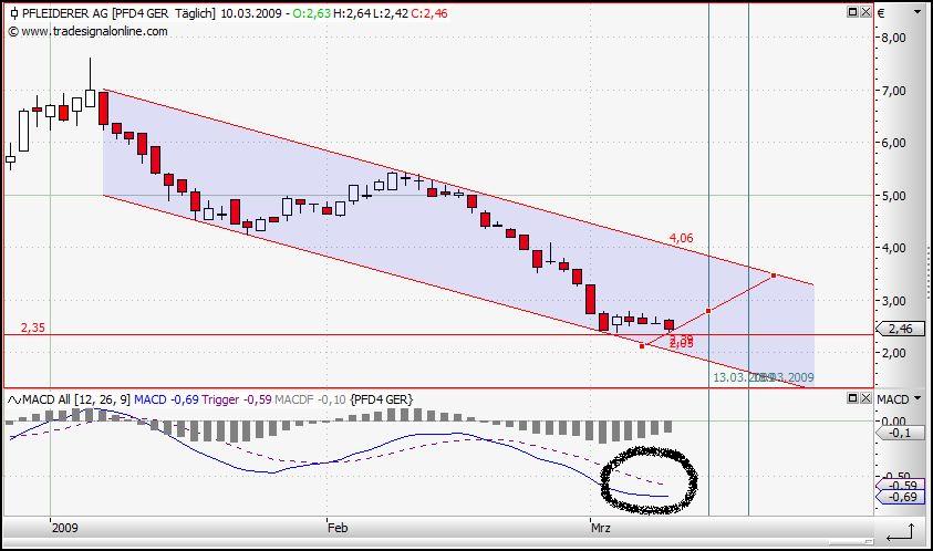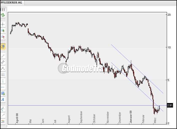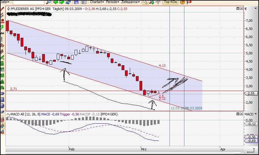 versuchen sollte, alles Charts zu ergründen ! Davon lasse ich aber die Finger. Einfache Regel als Laie : nur dort den Chart ansetzen, wo man ihn auch ganz sicher nachvollziehen kann. Das versuche ich. Und muss leider sagen, dass ich seitem ich dies beherzige, damit ganz gut laufe. Wer beispielsweis kauft, währen die Aktie sich in einer permanenten Abwätrsbewegung befindet, ist selbst dran schuld. In einem bearischen Markt, wie dem hiesigen, kann man nur dabei sein, wenn man die als technische Gegenbewegung bezeichnete Aufwärtsbewegung erfasst hat (das machen nämlich auch die Profis, deren Entscheidungen wir immer hinterherlaufen, deshalb geht übrigens die Aktie ja auch wie am Schnürchen den Trendkanal etlang !). D.h. dann kaufen, wenn die Kerze genau unten angekommen ist. Und bei Pfleiderer war sie schon unten ! Jetzt gehts dort - auch wenns heute nicht danach aussah - bergauf !