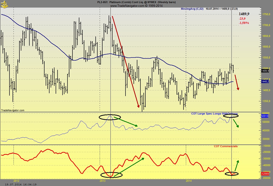 Im roten Zeitraum ende 2013 sieht man das die Fonds und Banken eigentlich durchgehend nicht sonderlich in Platin investiert waren, stattdessen fingen sie agressiv an den Markt zu shorten, was den Bankstern auch gelang.