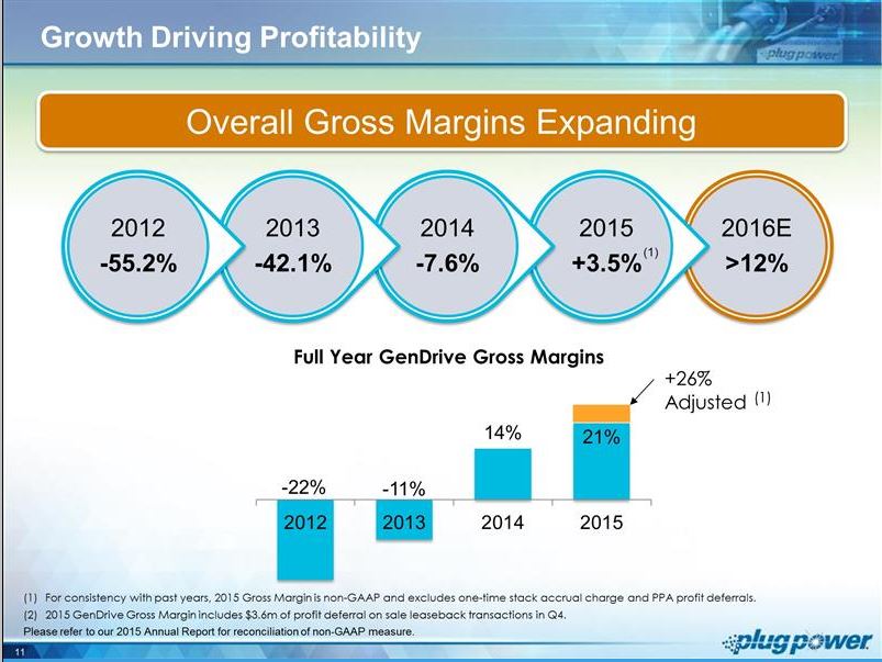 The Company also realized dramatic improvements in GenDrive margins, significantly exceeding the Company's aggressive expectations for 2015. GenDrive achieved gross margin of 25% by year end 2015 and 21% for the full year. Before deferred profit (described below), the GenDrive product line achieved adjusted gross margin of more than 35% for the fourth quarter, and more than 26% for the year.