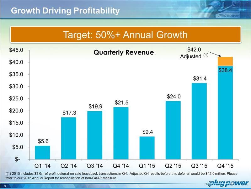 Plug Power achieved these revenue totals despite deferring $3.6 million of revenue in the fourth quarter of 2015 on certain GenKey sales that were done as sale-leaseback transactions. Generally accepted accounting principles (GAAP) require that any gross profit on sales-leaseback transactions be deferred and recognized over the life of the related lease term. This is a direct result of the increased profitability of Plug Power products, specifically GenDrive, in the fourth quarter.