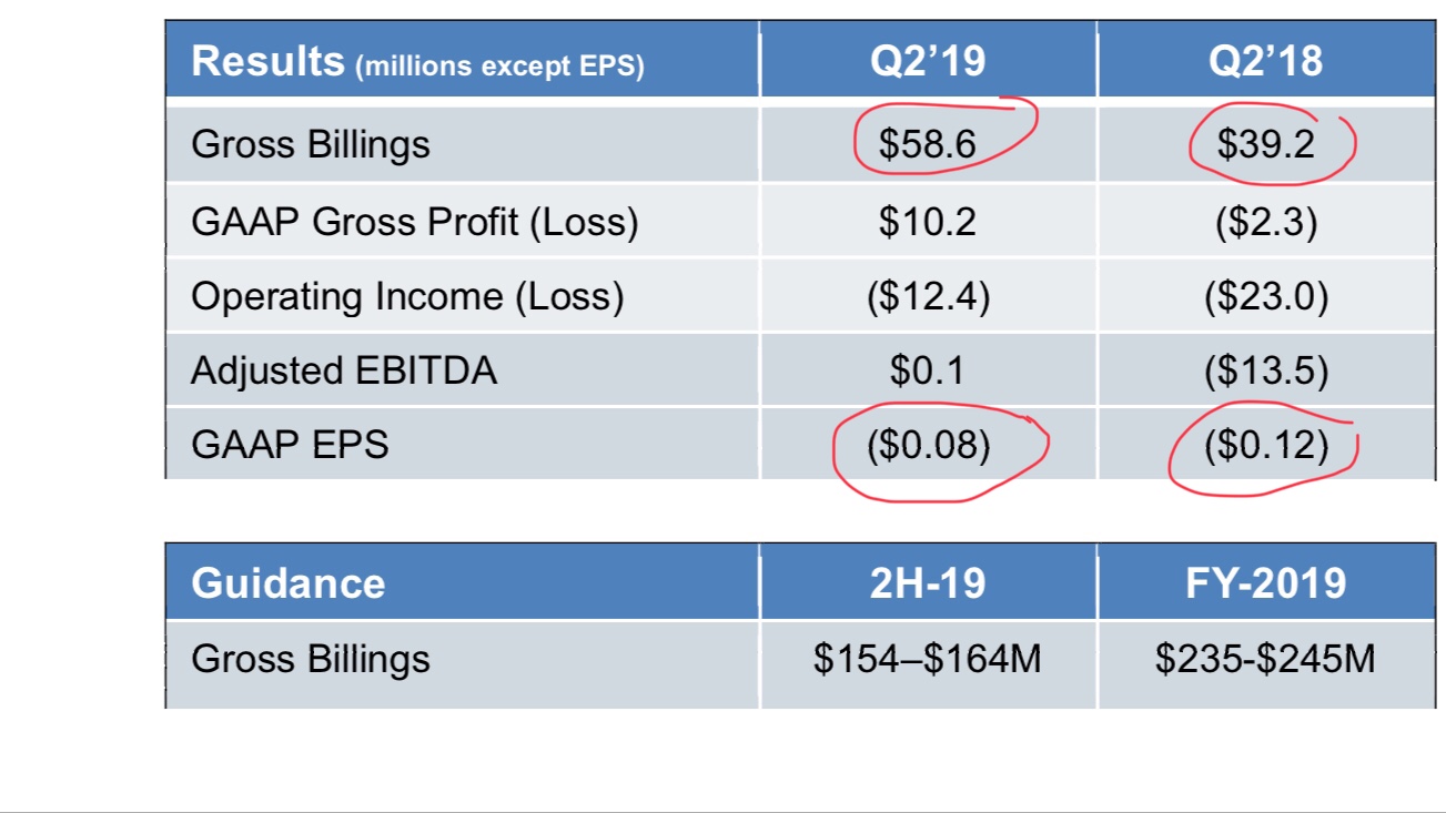 Wir bekräftigen unsere Prognose für die Brutto-Rechnungsstellung für das Gesamtjahr 2019 von 235 bis 245 Millionen US-Dollar. Betriebsergebnis