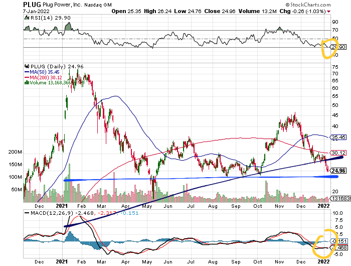 Die Negativ-Performance erreichte in 2021 ganze Minus 43%, nachdem vorübergehend eine Vervierfachung zu Buche stand. Mit einer Marktkapitalisierung von 2,1 Mrd. USD beträgt das aktuelle KUV auch noch hohe 22. Die ersten Gewinne soll es aber erst in 2025 geben, bei PlugPower könnte dies bereits in 2024 der Fall sein.