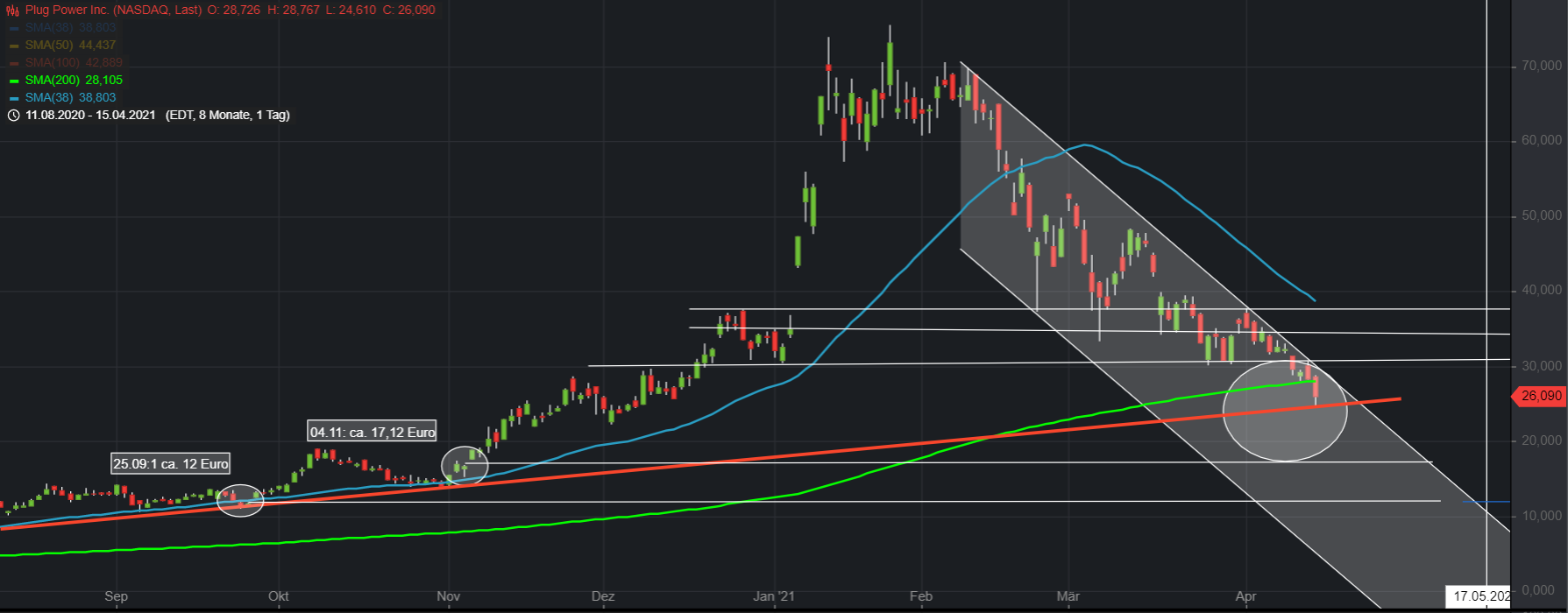 Die Plug-Power-Aktie traf es in dieser Woche wieder mit voller Wucht. Knapp 20 Prozent Minus musste sie seit Montag einstecken. Mitte der Woche machte sich noch die Hoffnung breit, dass der Kurs sich erfolgreich über der massiven Unterstützung an der 200-Tage-Linie bei 28 Dollar halten könnte (DER AKTIONÄR berichtete). Wie vermutet überwog die hohe Trendstärke, weswegen der Kurs am gestrigen Donnerstag mit einer dynamischen Abwärtsbewegung den GD200 nach unten durchbrach und damit ein enorm starkes Verkaufssignal generierte.