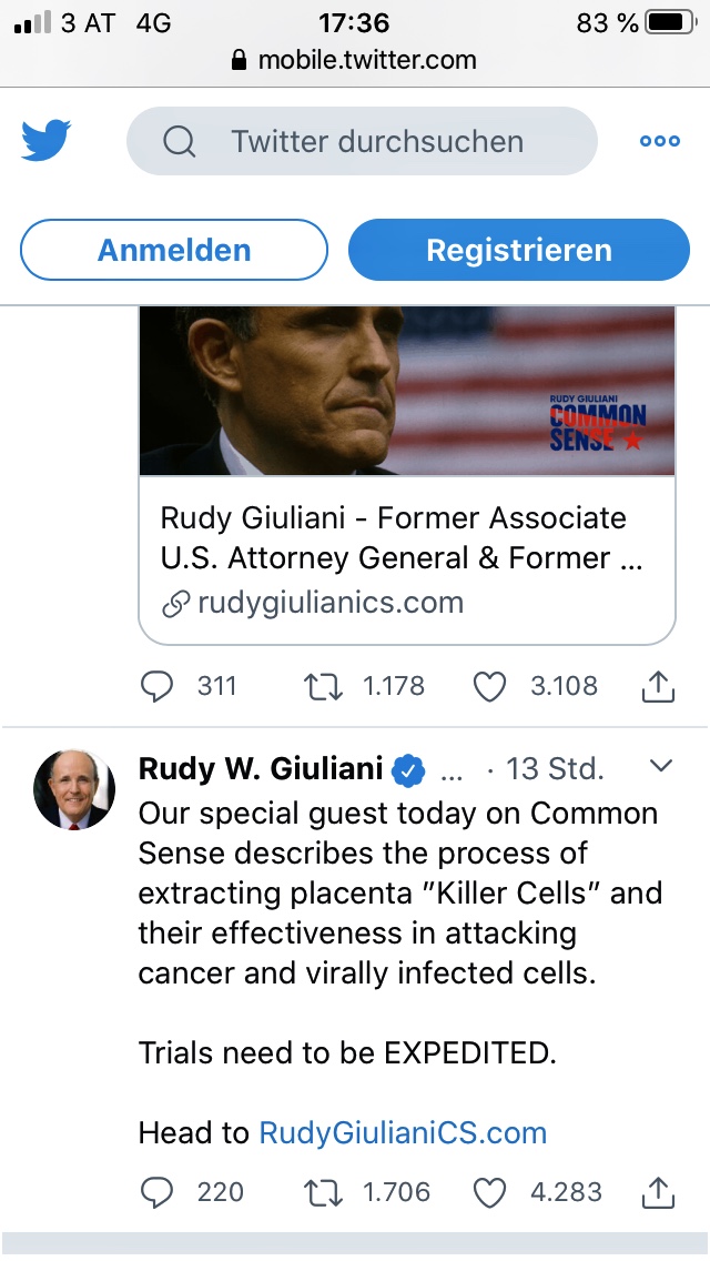 Vor wenigen Stunden hat Rudy Giuliani, einer der Anwälte von D. Trump Stammzellen basierte Therapieformen für Covid-19 (plus Erwähnung Plazenta Bezug) empfohlen und beschleunigte Initiative in die Richtung empfohlen, siehe auch mobile.twitter.com/RudyGiuliani