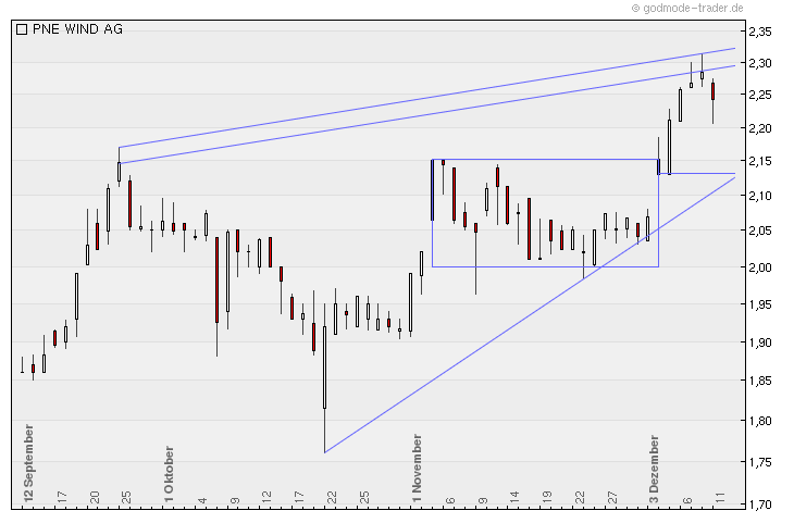 - es liegen nach wie vor größere vk order bei 2,28 und 2,32 an ; aber nach " richtig "unten ist der boden vorerst ,nicht nur wegen des rückkaufprogramms, zwischen 2,15 und 2,0 ziemlich massiv gestaltet ( siehe rechteck ) - als charttechnische unterstützung sehe ich aber vorerst die 2,13x an , da dort der obere bereich des letzten gap ups auf die längerfristige unterstützungslinie trifft. um dieses kreuz nach unten zu durchbrechen müßte aber schon einigen tausend privatanleger plötzlich der gedanke gekommen sein, dass für weihnachtsgeschenke einiges an fiat nötig ist, um den kurs in diese richtung drücken zu können. und damit würden sie sich ihrer schönsten geschenke selbst berauben.