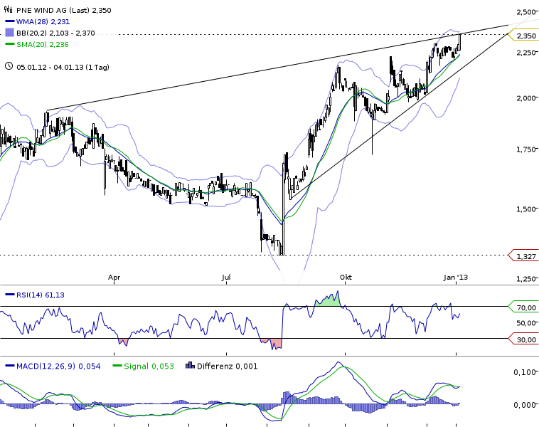 ob die aktie den bullishen keil nach oben durchbrechen kann. müßte bei ca. 2,44 sein und sollte auch lt. chartbild bald möglich sein - ein abverkauf auf werte unter die unterstützungslinie macht es für die bullen allerdings schwieriger und ließe erstmal auf eine seitwärtsbewegung mit deckel und dickem boden erwarten . nur meine meinung.......