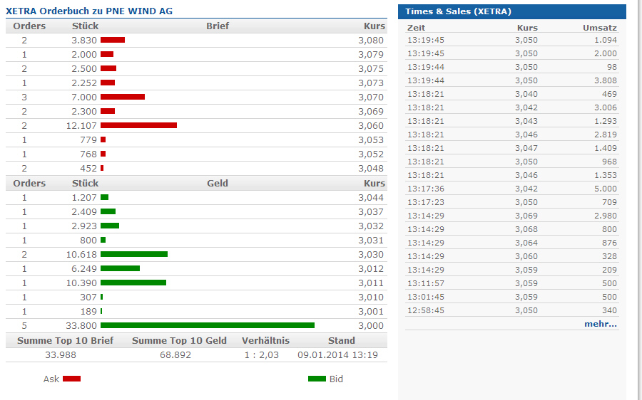Und wie schon einer vor mir sagte: Als die Prognose wackelte, die Dong-Entscheidung noch ausstand und alle mit einer Gewinnwarnung gerechnet haben, stand PNE bei 2,80. Jetzt kamen so viele gute Nachrichten und wir stehen immernoch da? Diese Imbalance wird sich schon noch auflösen, wenn PNE einen guten Jahresabschluss über 2013 vorlegt.