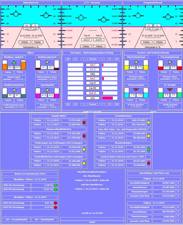 Negativ: Gesamtleistungsrendite, Eigenkapital- und Rohertrag II-Quote minimal verschlechtert. Nettofinanzverbindlichkeiten (liquide Mittel - Finanzverbindlichkeiten) von -100 Mil. € auf -156 Mil.€ ausgeweitet; davon jedoch auf Grund der erstmaligen Erfassung von Leasingverbindlichkeiten ca. 15 Mil. €.