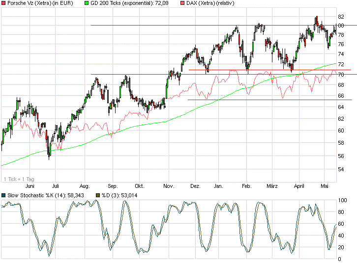 Der Porschekurs bewegt sich seit dem letzten November synchron zum Dax. Zunächst haben sich beide noch aufwärts bewegt (das war die damalige "Jahresend-Rallye"). Ab Mitte/Ende Dezember sind beide Verläufe in ein Seitwärtsband übergegangen, in dem sie sich wieder weitgehend synchron bewegen (der Porschekurs in einem Band zwischen 70,- und 80,- Euro, wenn man vom Fehlausbruch im April absieht).