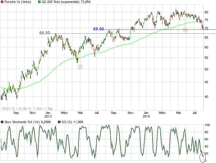 Im Moment betrachte ich den Test der Unterstützung bein 70,- Euro noch nicht als gescheitert. Scheitert er dennoch, wäre mE. mit weiteren Abgaben bis 66,30...65,- Euro (= 6,6 %) zu rechnen. Deutliche Zwischenerholungen sollte man einplanen (siehe Slow Stochastik!).