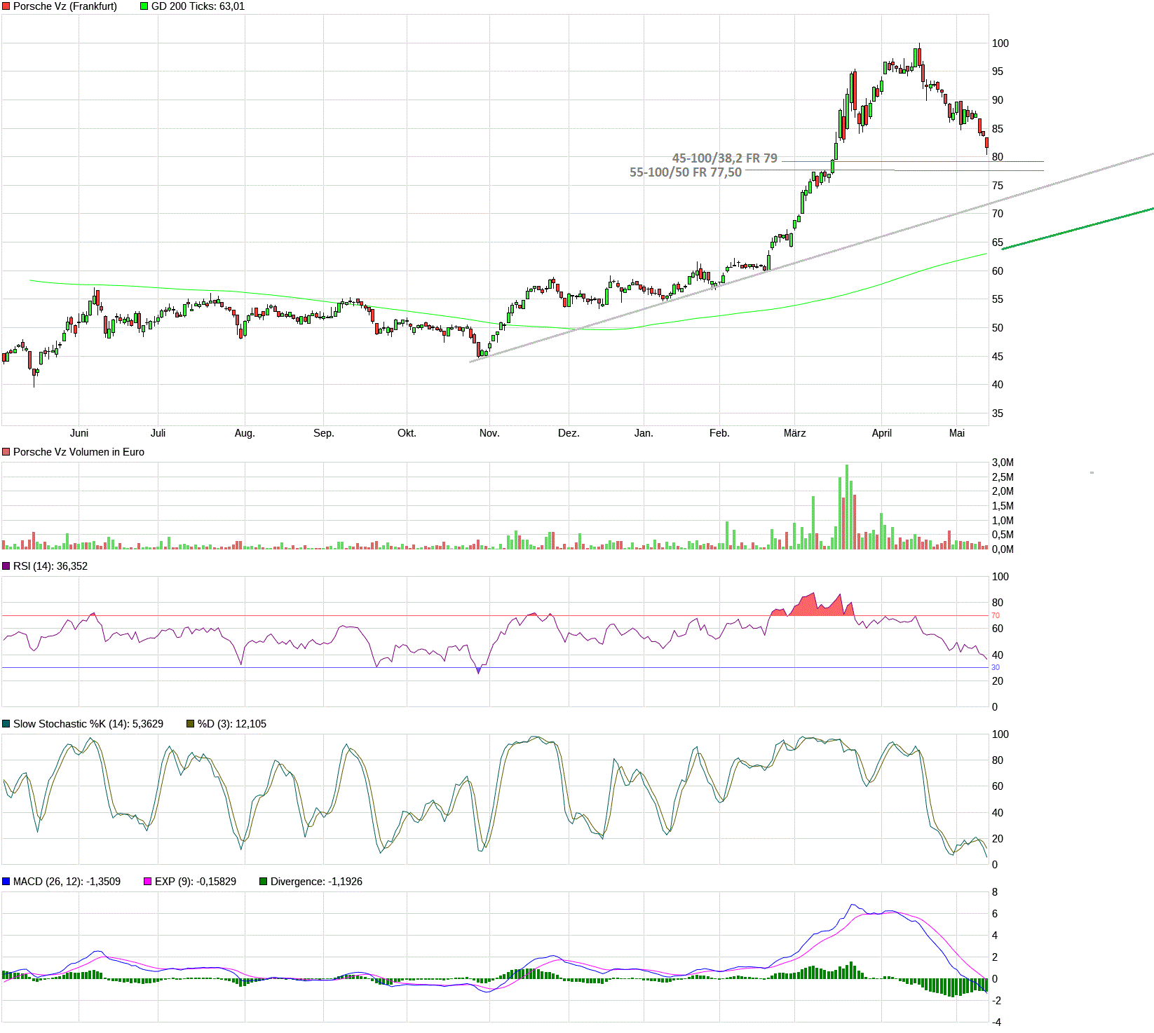 In diesem Fall hätten wir nicht nur eine Gesamtkorrektur von 30%; auch der Aufwärtstrend, der ab Oktober etabliert wurde, wäre obsolet. Ehrlich gesagt, halte ich dieses Szenario für ziemlich unwahrscheinlich, da die Nachrichtenlage für Porsche bzw. den VW-Konzern einfach zu gut ist.