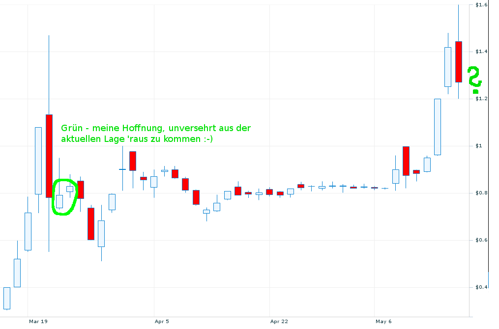 Bei einem Aktienzusammenschnitt hätten sich übrigens gerade mal Werte von 1,20 - 1,50 $ ergeben (für eine Aktie), so dass ein 10 : 1 Verhältnis schon unterster Ansatz gewesen wäre, wenn nicht gleich 15 : 1 . Dann sind wir bei den Werten von ca. 25,00 $, die hier schon mal in Rede stehen. Muss man mehr hierzu sagen?