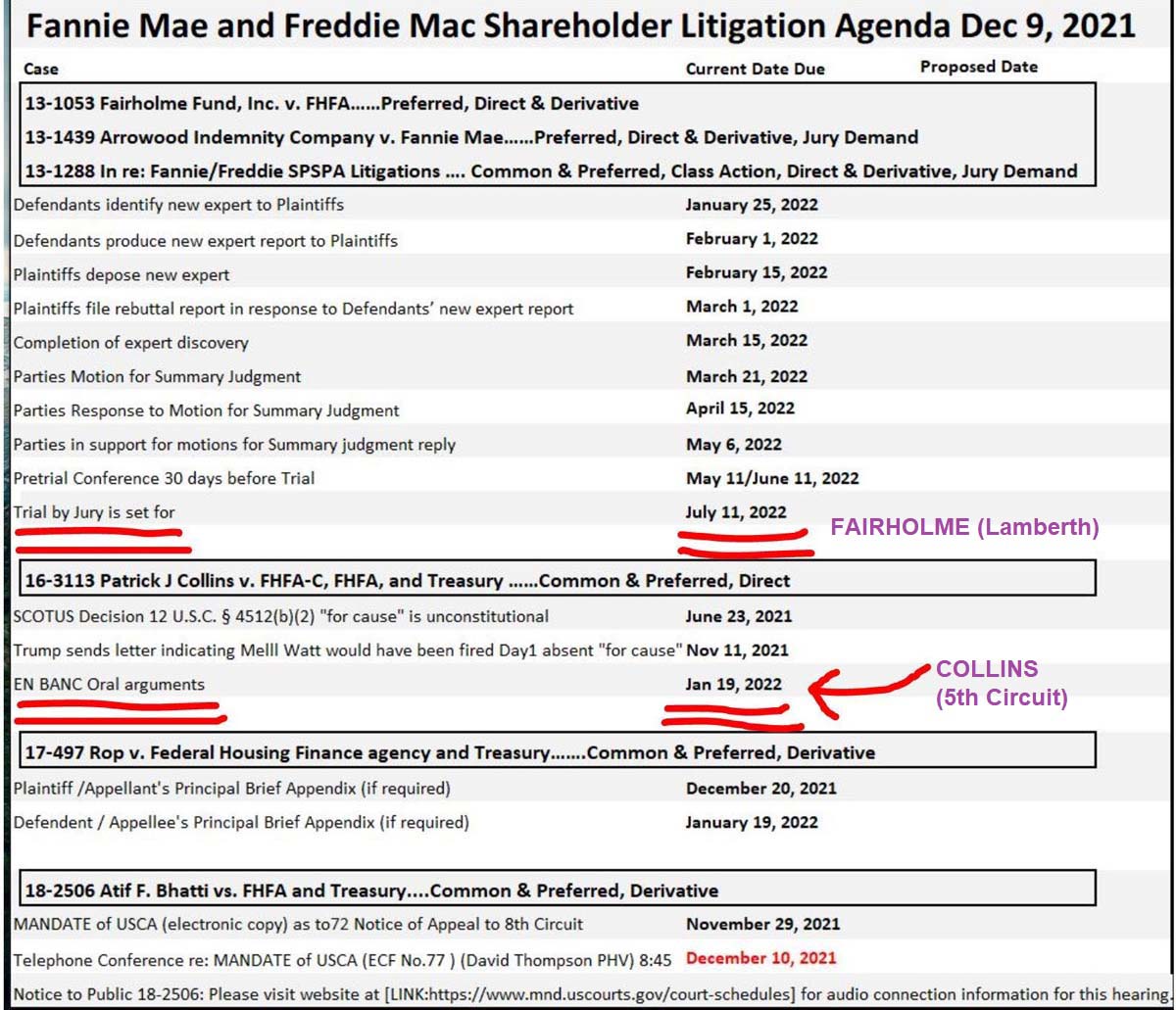 Gerichtsurteile (auch anstehende) könnten der Regierung in 2022 "Beine machen". Bei Collins winkt nach dem Trump-Brief Schadensersatz (Verhandlung ist Mitte Jan.), ebenso bei Lamberth im Sommer. Im Prinzip können FHFA und Schatzamt jederzeit eine Briefvereinbarung vorlegen, die (auch zur Abwehr drohender Gerichtsforderungen) die KE/Freilassung anleiert.