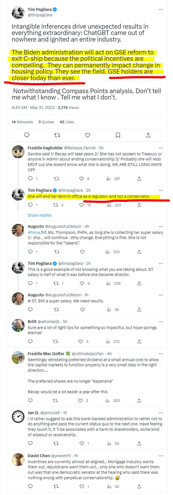 Hintergrund ist ein Auszug aus Calabria neuem Buch. Darin hat C. erklärt, dass die Regierung zu seiner Zeit als FHFA-Direktor angedacht hatte, die SPS und die JPS gleichzeitig in Stammaktien umzuwandeln. Wenn nur die SPS in Stammaktien umgewandelt würden, wären die JPS danach sonst zur ranghöchste Aktie im "capital stack" geworden, und das wollte die Regierung nicht. (Sonst wäre wohl bei den JPS kein Haircut möglich.)