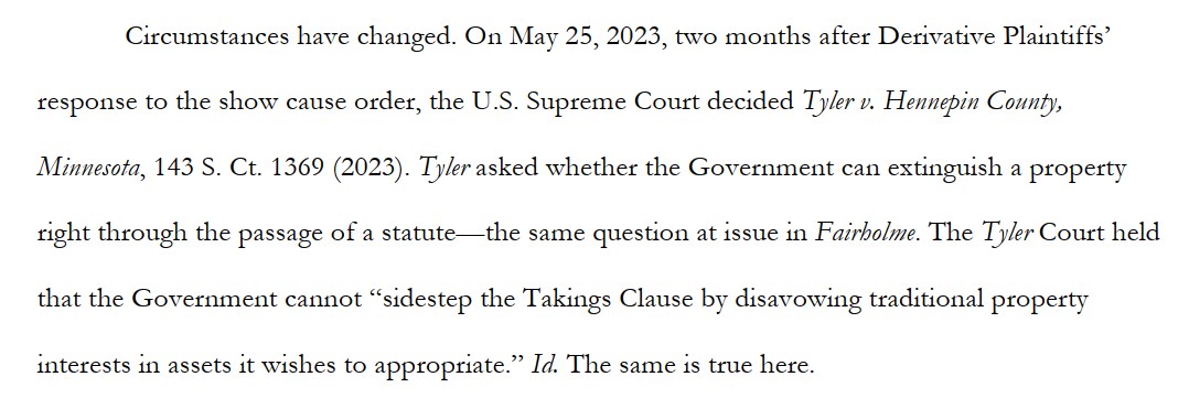 Wenn Privatfirmen unterkapitalisiert sind, dann setzen sie normalerweise die Dividendenzahlungen aus. FnF hingegen sind zwar zwangsverwaltet, aber formal immer noch privat. Die Sorgfaltspflichten aus einer Zwangsverwaltung wurden klar verletzt, und Scotus hat das 2021 sogar höchstrichterlich abgesegnet, weil "es der FHFA und der Allgemeinheit, denen die FHFA dient, nützt". HERA würde die Zwangsverwaltung FHFA zu praktisch allem ermächtigen, und HERA verbietet zugleich, dass dagegen geklagt wird.