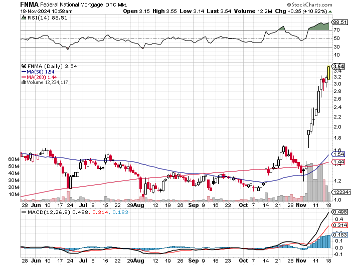 Nach heutigem Stand (Chart unten) notieren die Fannie-Stämme jetzt schon bei 3,57$. Deshalb vermute ich: Viel höher können sie kaum mehr steigen, außer ein Reddit-Momo-Momentum treibt sie "ballistisch" höher (was dann allerdings keine fundamentale Grundlage mehr hätte).
