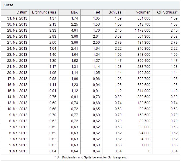 | 08.08.2013 15:30:00 | 1,61 | 1,67 | 1,55 | 1,64 | 4 Mio. |