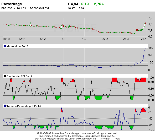 | 17 | 4.588 | ++Powerbags AG++ 8 MW verkauft ++ DGAP | zoccies | Beobachter21 | 21.04.10 13:20 | |