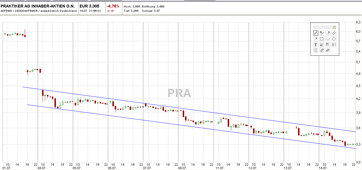 hallo. ich finde die aussagen über die praktijker AG echt merkwürdig. hier werden krampfhaft weiter negative nachrichten generiert. leute lasst euch nicht verarschen - der boden ist schon lange erreicht. es werden jeden tag gezielt negative nachrichten zu dem wertpapier gestreut um den kurs jeden tag ein bischen weiter zu drücken. ich finde es nur merkwürdig, dass sich leute darauf einlassen - okay der ca. 30% abrutsch nach unten des kurses ist ziemlich realistisch zu bewerten, nach der gewinnwartung - kurse unter 4 euro sind hier meiner meinung nach nur der panik-mache zu verschulden. und davon profitieren leute.