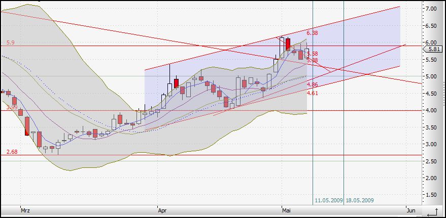 Dieses Kursmuster wurde wie klassisch zu erwarten war, nach oben hin aufgelöst und so ein neues Kaufsignal generiert. Anschlusskäufen bis auf 6,20 Euro folgte anschließend erneut eine seitwärts gerichtete Konsolidierungsphase, in der sich 5,50 Euro als kurzfristige Unterstützung herauskristallisierte.