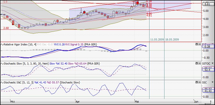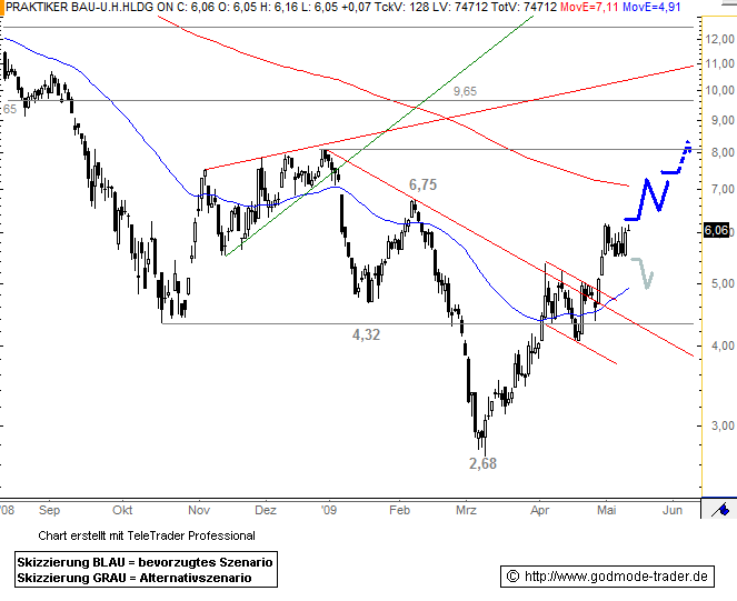 Charttechnischer Ausblick: Das Sentiment in den Aktien von Praktiker ist aktuell bullisch zu werten und gelingt nun auch noch der Ausbruch über 6,20 Euro, so wären weitere Kursgewinne bis auf 7,10 Euro möglich. Darüber eröffnet sich dann weiteres Aufwärtspotential bis auf 8,10 Euro.