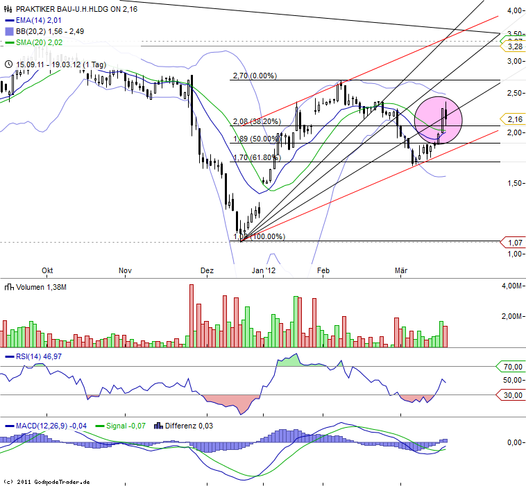 19.03.2012 (www.4investors.de) - Nachdem die Praktiker-Aktie sich vor einigen Tagen nach einer Abwärtsbewegung stabilisiert hat, hat der Titel zuletzt wieder deutlich Gewinne verzeichnet. Die Aktie hat deutlich Terrain zurückgewinnen können, vor allem am Freitag hat der Titel mit einem Anstieg um 15,5 Prozent auf 2,295 Euro Schwung aufgenommen. Die Aufwärtsbewegung hat am 6. März bei 1,65 Euro begonnen, mittlerweile wurde die Widerstandszone bei 1,93/2,01 Euro wieder überwunden.