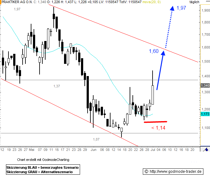 Hinter den Kulissen ist jede Menge Bewegung und Praktiker ist eine Krimistory, wie sie die Börse schon lange nicht mehr erlebt hat. Vom Untergang bis hin zur sagenhaften Turnaround-Story ist alles offen. Wer bei Praktiker einsteigt, darf keine schwachen Nerven haben aber darf sich gewiß sein, daß viele ältere Aktionäre schon sehr leidgeprüft sind und genügend Nerven gelassen haben. Meine persönliche Meinung ist, daß diese Firma unter neuen Voraussetzungen, sehr gute Chancen hat auf einen Neustart. Der Kurs der Aktie soll von mir aus noch weiter runtergehen- das sind nach meiner Meinung die besten Voraussetzungen für einen Turnaround.