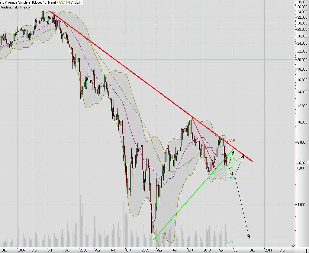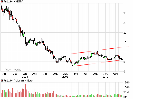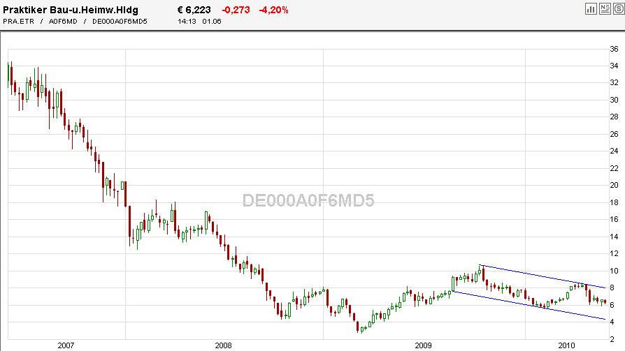 Schaut man sich das große Bild an, ist Praktiker dennoch in einem Aufwärtstrend, allerdings am unteren Rand der Unterstützung. Sollte diese nicht halten sehe ich charttechnisch keine vernünftige Unterstützung außer dem 2009 Tief.