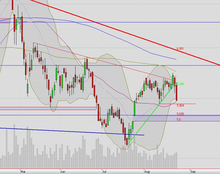 Dieser Widerstand stellt sich aktuell den Käufern in den Weg. Aufgrund eines intakten Aufwärtstrends und dem erst heute generierten Kaufsignal (Ausbruch aus der kurzfristigen Schiebezone) aber, sollte dieser Hürde nur temporärer Natur sein. Anschließend liegt dann bei ca. 7,20 Euro die mittelfristige Abwärtstrendlinie.