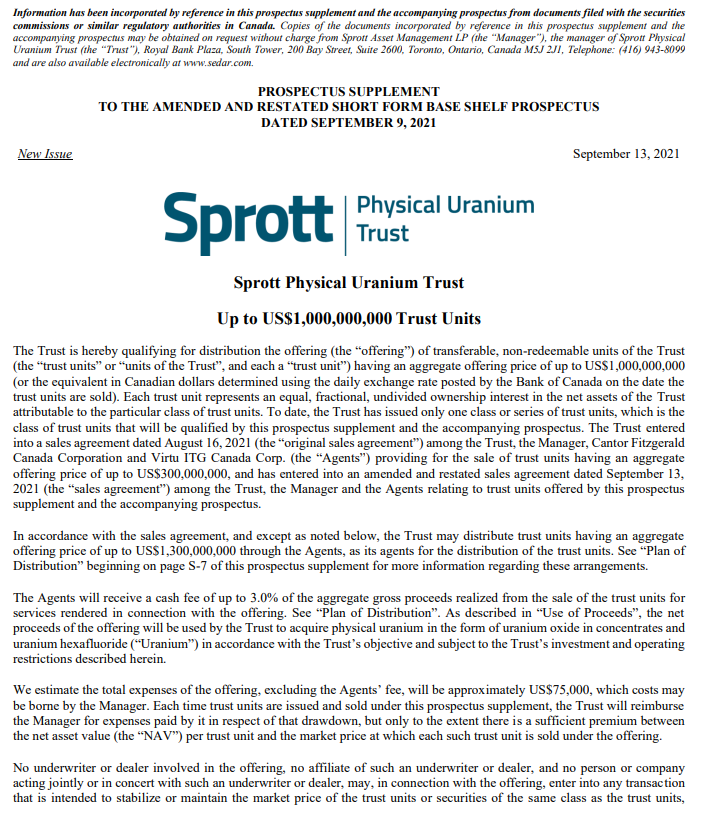 As shares of U.U are issued Sprott takes that money and buys uranium, which increases their NAV. So long as they have a premium to NAV they keep buying. They’ve only been buying physical uranium for two weeks now, but they’ve already purchased 13.3% of the estimated global uranium production for all of 2021. Read that sentence again. 20.59m lbs of the projected world supply of 154m lbs. Jesus Christ are these guys a market force to be reckoned with. How is this not illegal? They've only been buying for TWO FUCKING WEEKS.