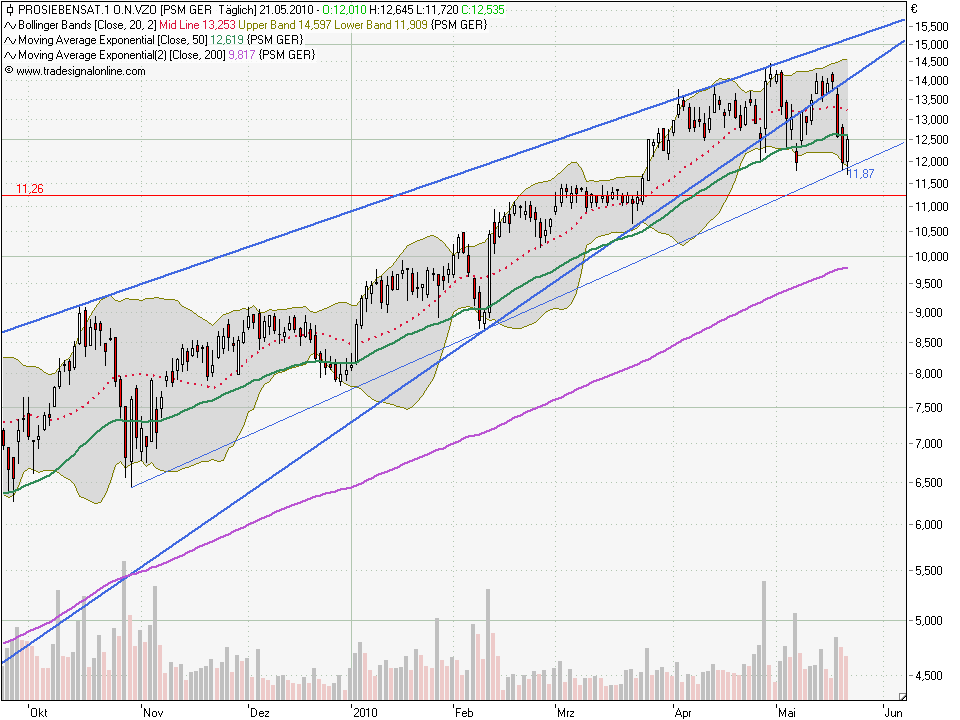 Der mittelfristige Aufwärtstrend besteht aber seit Ende Oktober 2009 (nicht seit Januar 2010) und verläuft momentan bei etwa 11,90. Er wurde die letzten Tage ziemlich exakt getestet und durch den Abprall zunächst bestätigt.