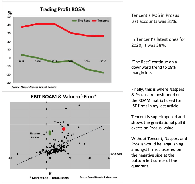 Viel schwerwiegender ist jedoch das hier: www.biznews.com/sa-investing/2021/05/28/ted-black-prosus. Kurz gesagt: Nur der Tencent-Anteil wirft Gewinne ab, alle anderen Investments sind defizitär (siehe ROAM Chart). Das ist bei Growth nicht unüblich, bedeutet aber, dass das direkte Investment in Tencent weniger riskant ist. Also müsste Prosus eigene Aktien zurückkaufen, was sie aber laut Spreadsheet seit März nicht mehr tun. Die Kritik in Südafrika reisst jedenfalls nicht ab, und da sitzen die Pensionsfonds die Naspers vornehmlich halten.