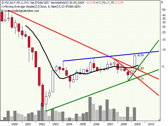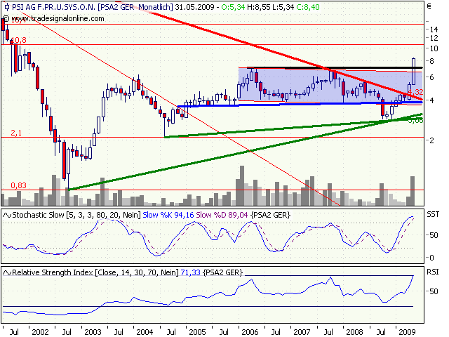 Der Aktie jedenfalls hat das Machtgezerre um PSI gut getan. Der Aktienkurs hat sich seit Anfang April nahezu verdoppelt und ein Sieben-Jahres-Hoch erreicht. Der Kurs spiegelt aber auch die Anerkennung für zuletzt starke Quartalszahlen wider. 2008 konnte PSI den Umsatz um fünf Prozent auf 129 Millionen Euro und das Betriebsergebnis um über 50 Prozent auf 6,23 Millionen Euro steigern. Im ersten Quartal setzte sich das hohe Wachstumstempo fort. Das Betriebsergebnis kletterte von 0,8 auf 1,3 Millionen Euro, der Umsatz erhöhte sich um mehr als zehn Prozent auf 30,6 Millionen Euro.