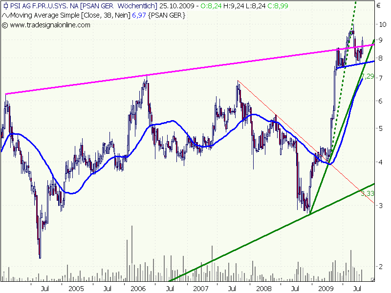 Die Markterwartungen vom EBIT der PSI-AG liegen m.W. durchgehend unter 9 Millionen Euro. Ich gehe davon aus, dass PSI 2009 rund 20 Prozent darüber abschließen wird. Abstürzen wird die Aktie deshalb bestimmt nicht.
