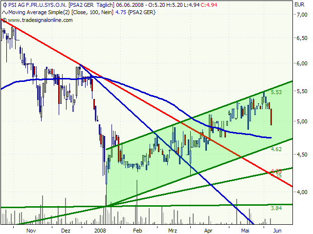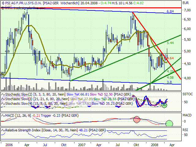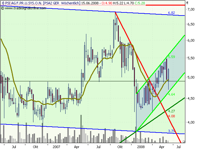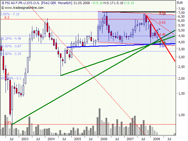 Der PSI-Konzern hat im 1. Quartal 2008 sein Betriebsergebnis (EBIT) auf 1,3 Millionen Euro (1. Quartal 2007: 0,9 Millionen Euro) gesteigert. Das Ergebnis vor Steuern erhöhte sich auf 1,0 Million Euro (1. Quartal 2007: 0,6 Millionen Euro), das Konzernjahresergebnis auf 0,8 Millionen Euro (1. Quartal 2007: 0,4 Millionen Euro). Der Umsatz verringerte sich vor allem durch den Verkauf des Behördengeschäfts zur Jahresmitte 2007 und den um mehr als 2 Millionen Euro geringeren Hardwareanteil auf 27,4 Millionen Euro (1. Quartal 2007: 32,6 Millionen Euro). Der Auftragseingang lag mit 36 Millionen Euro etwa auf dem Niveau des Vorjahresquartals, in dem noch etwa 2 Millionen Euro aus dem Behördengeschäft enthalten waren (1. Quartal 2007: 38 Millionen Euro). Der Auftragsbestand erhöhte sich auf 86 Millionen Euro (31.03.2007: 79 Millionen Euro). Der operative Cashflow war mit 2,7 Millionen Euro positiv (1. Quartal 2007: -1,2 Millionen Euro), die liquiden Mittel erhöhten sich auf 21,4 Millionen Euro (31.03.2007: 13,9 Millionen Euro).