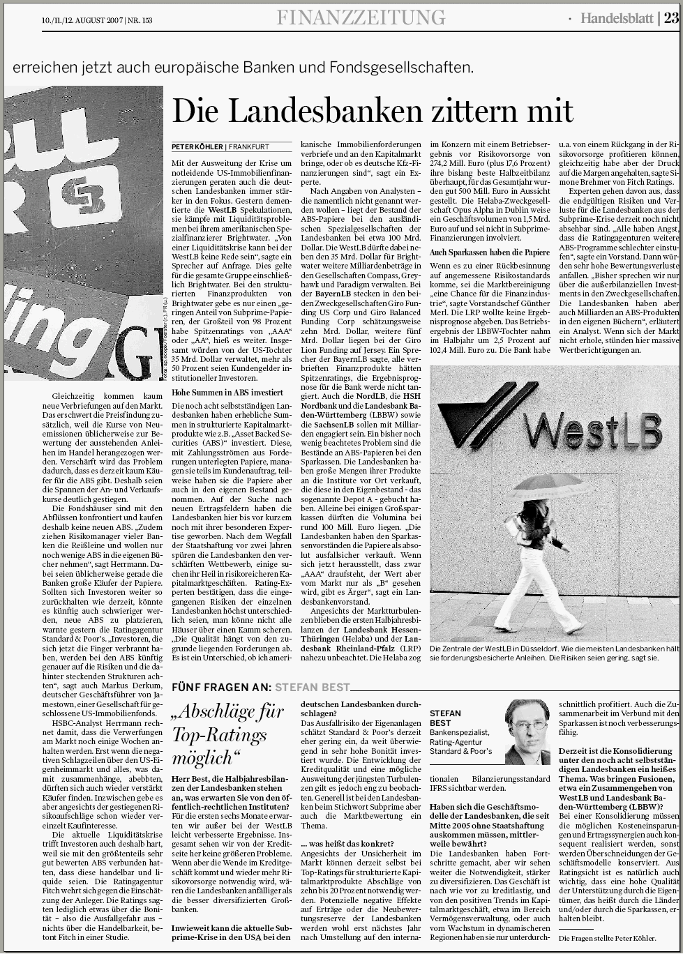 Die Frage ist jetzt, was für Probleme der Markt hat. Momentan ist es so, dass keine Bank der anderen über den Weg traut, weil diese ja von den Folgen der US Immobilienkrise und/oder der Junkbondsprobleme betroffen sein könnte. Kurzum, die Banken horten Liquidität. Auch das ist verständlich, wenn man sich die Geschichte einer bestimmten deutschen Förderbank ansieht.